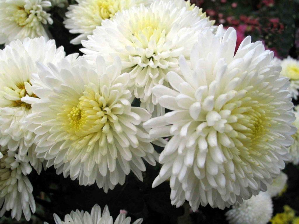 Les chrysanthèmes blancs (White Eleanor, White Korean, Evelyn Bush) sont considérés comme les plus beaux. Cela s'explique par leur combinaison unique de nuances. Les pétales blancs de ces fleurs naissent d'un cœur jaune vif.